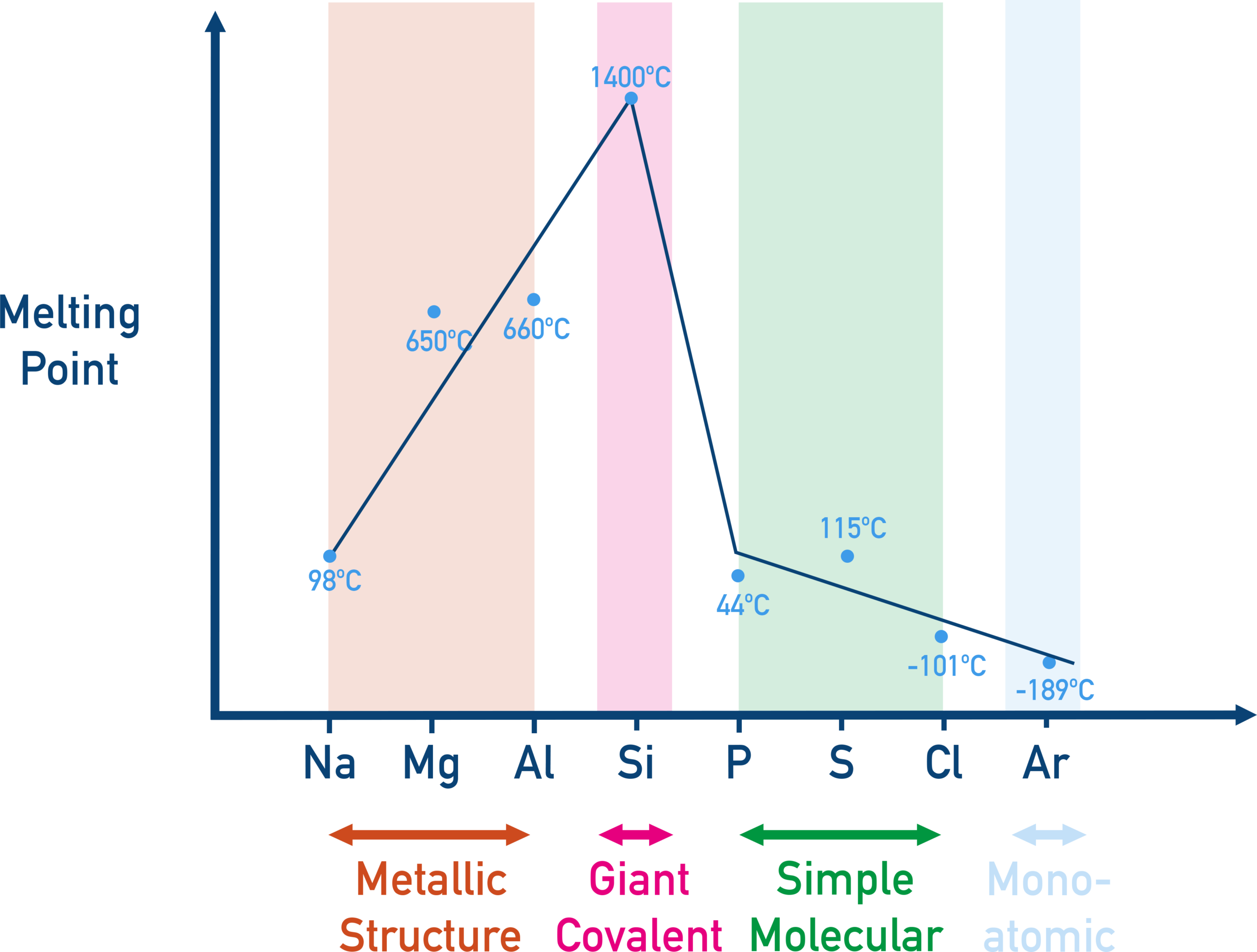 Melting points increase from sodium to aluminium due to stronger metallic bonding. Silicon has a very high melting point because it has a giant covalent structure. Melting points then decrease sharply for phosphorus, sulfur, chlorine and argon because these are simple molecular substances with weak intermolecular forces.