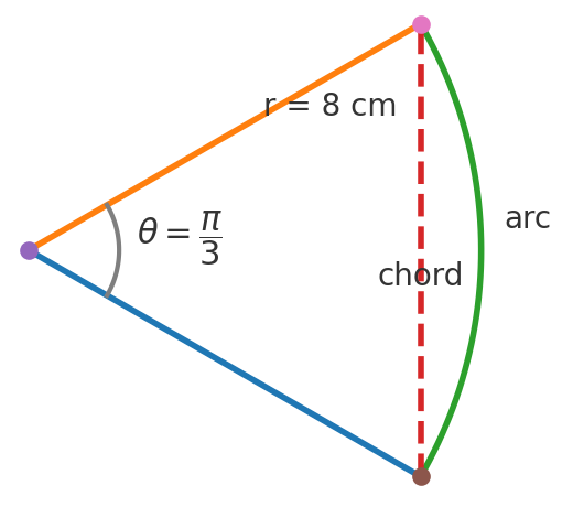 The triangle formed is isosceles with two sides of length \(r = 8\), and included angle \(\theta = \dfrac{\pi}{3}\).