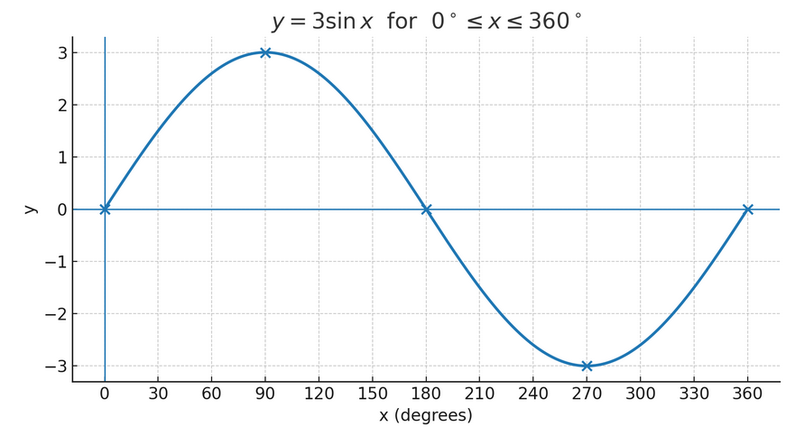 Sketch the graph of \(y = 3 \sin x\) for \(0 \leq x \leq 360^\circ\).