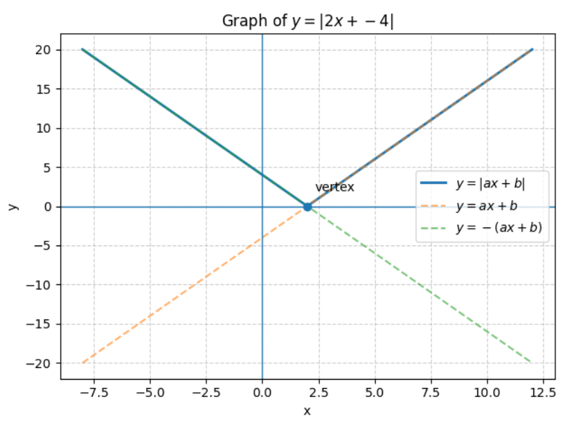 This produces a “V-shaped” graph, with the corner (vertex) at the point where \(ax+b=0\).