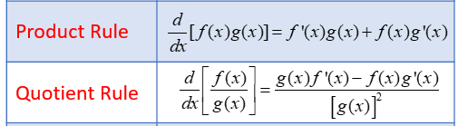 - Quotient Rule: \(\dfrac{d}{dx}\left[\dfrac{f(x)}{g(x)}\right] = \dfrac{f'(x) g(x) – f(x) g'(x)}{[g(x)]^2}\)