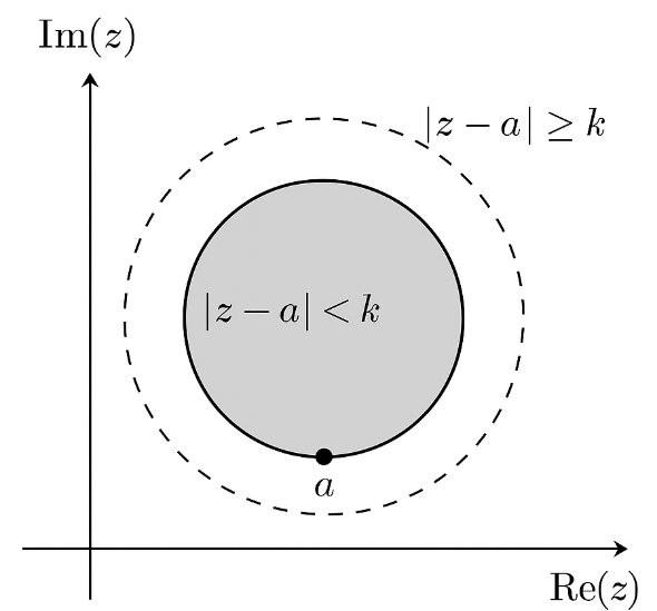 - The condition \(|z – a| < k\) represents the set of points inside this circle (open disc). Geometrically: the interior region of the circle.