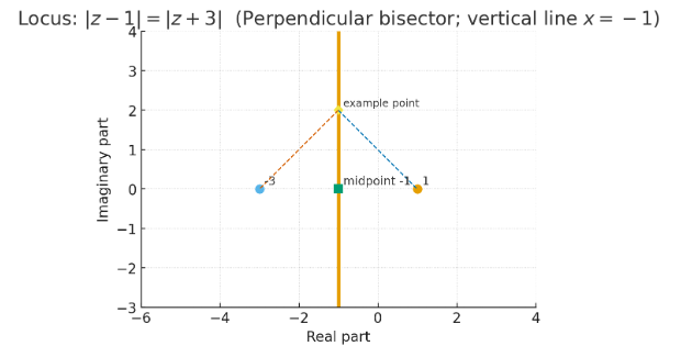 Points equidistant from \(1 + 0i\) and \(-3 + 0i\). This is the perpendicular bisector of the line joining \((-3,0)\) and \((1,0)\).