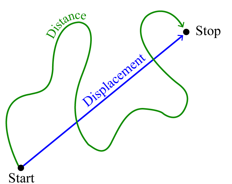 - Distance: The total length of the path travelled by a particle, irrespective of direction.