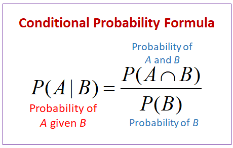 \( P(A \mid B) = \dfrac{P(A \cap B)}{P(B)}, \quad \text{where } P(B) \neq 0 \)