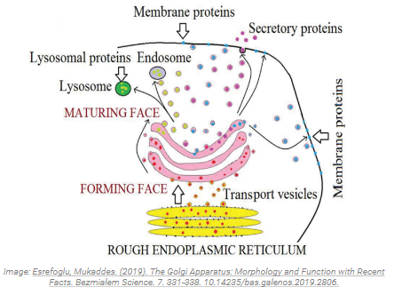 • stack of flattened sacs (cisternae) formed by the vesicles which bud off from the RER
