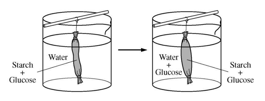 A common laboratory investigation involves putting a solution of starch and glucose into a dialysis bag and suspending the bag in a beaker of water, as shown in the figure below.