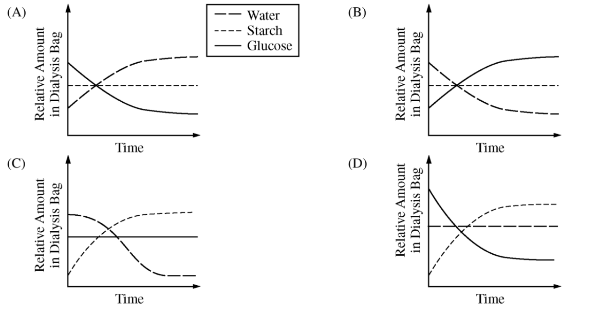 The investigation is aimed at understanding how molecular size affects movement through a membrane. Which of the following best represents the amount of starch, water, and glucose in the dialysis bag over the course of the investigation?
