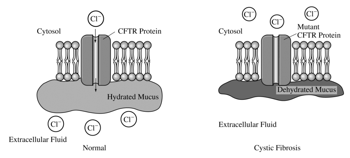 Cystic fibrosis is a recessively inherited disorder that results from a mutation in the gene encoding CFTR chloride ion channels located on the surface of many epithelial cells. As shown in the figure, the mutation prevents the normal movement of chloride ions from the cytosol of the cell to the extracellular fluid. As a consequence of the mutation, the mucus layer that is normally present on the surface of the cells becomes exceptionally dehydrated and viscous. An answer to which of the following questions would provide the most information about the association between the CFTR mutation and the viscous mucus?