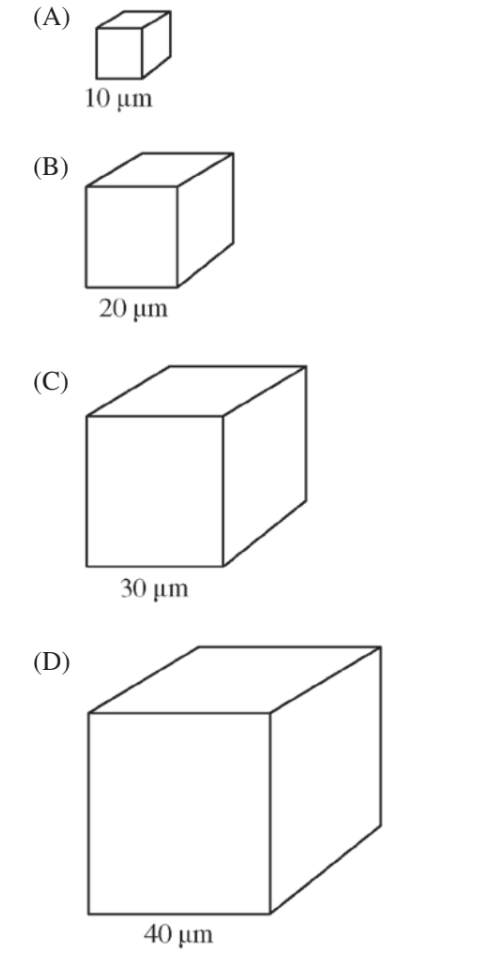 Simple cuboidal epithelial cells line the ducts of certain human exocrine glands. Various materials are transported into or out of the cells by diffusion. (The formula for the surface area of a cube is \(6\times S^2\) , and the formula for the volume of a cube is\( S^3\) , where S = the length of a side of the cube.) Which of the following cube-shaped cells would be most efficient in removing waste by diffusion?