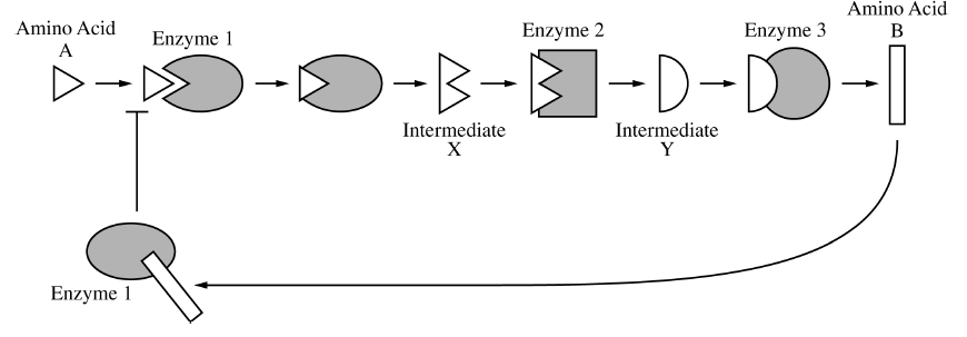 The binding of amino acid \(B\) causes the enzyme to change shape and prevents amino acid \(A\) from binding to enzyme \(1\).