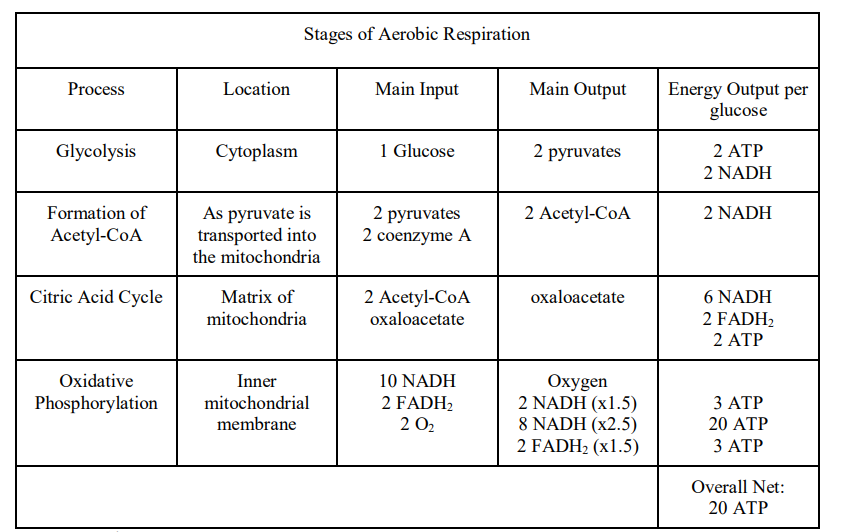➢$ C_6H_12O_6 + 6O_2 ⟶6CO_2 + 6H_2O + ATP$