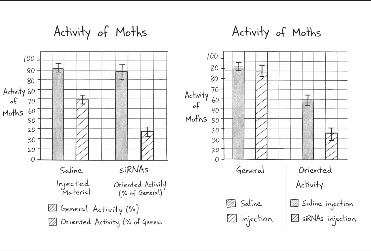 A correct graph would show the activity values for saline-injected moths and \( \mathrm{siRNA} \)-injected moths using clearly separated bars.