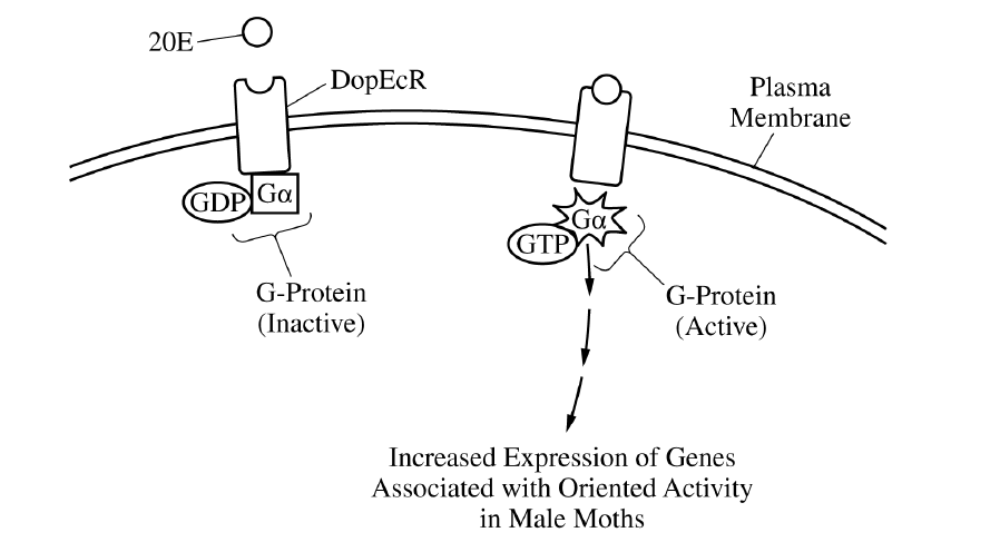 (ii) The scientists studied some moths with a mutation in the gene encoding the G protein. The mutation prevents GTP from displacing the GDP bound to the G protein. Based on Figure \( 1 \), predict the effect of this mutation on the oriented activity in male moths exposed to the pheromone.