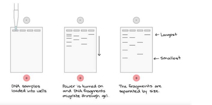 - DNA put into wells on negative end, and when a current is run through the gel, the DNA moves across gel according to their weight