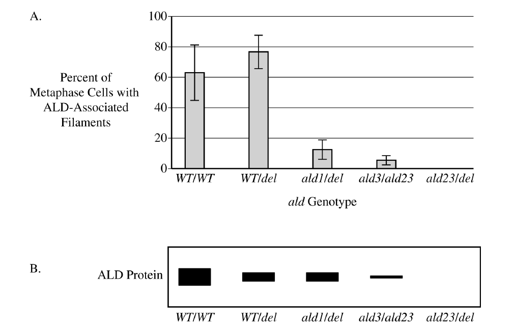 With about half as much protein, the \( WT/del \) cells show no difference in the percent of gamete-forming metaphase cells with ALD-associated filaments compared with the \( WT/WT \) cells.