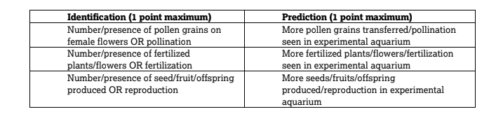 (b) The dependent variable would be amount of fertilization that occurs between the male and female seagrass. I predict that more fertilization will occur in the experimental aquarium because the invertebrates will transfer pollen from the males to females.