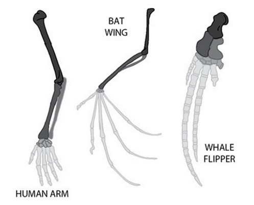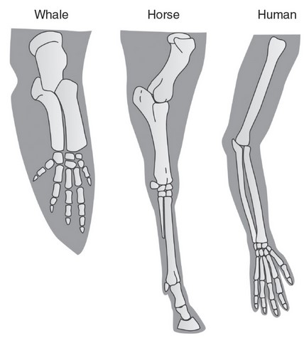 The following figure shows the bone structures of the limbs of a whale, a horse, and a human.