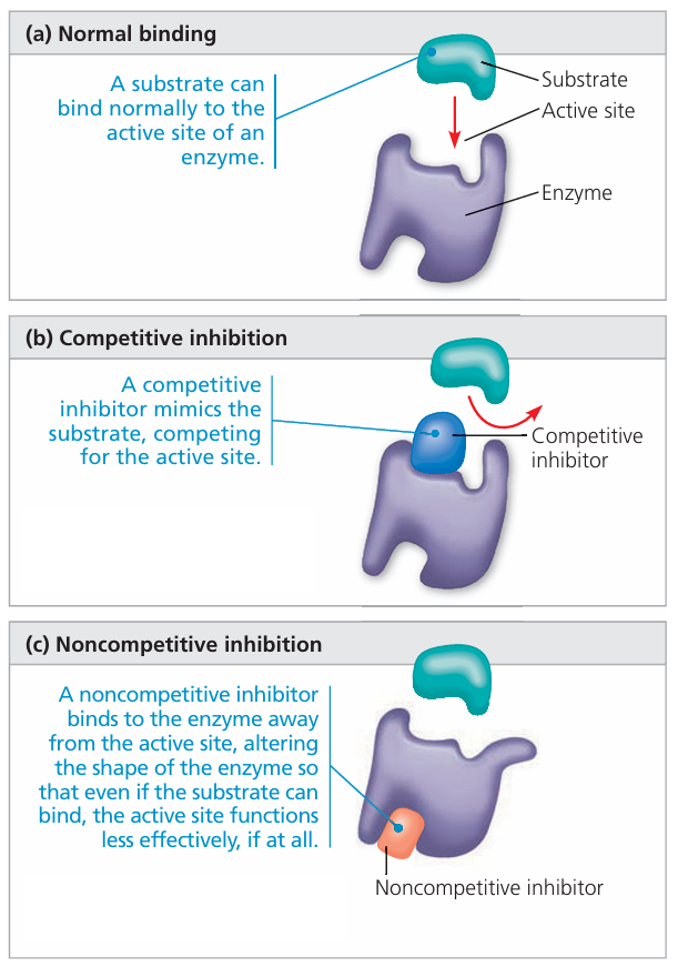 Too little substrate = slower reaction; too much product = slowdown due to feedback inhibition.