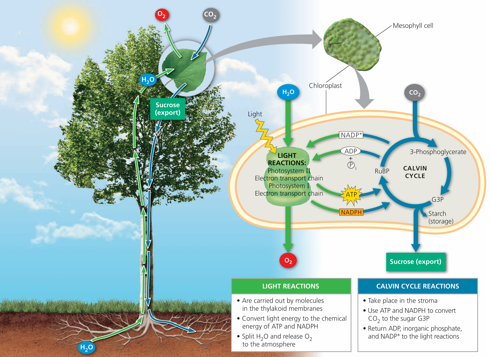 The light reactions charge the battery (ATP/NADPH), and the Calvin cycle spends it to build sugar.