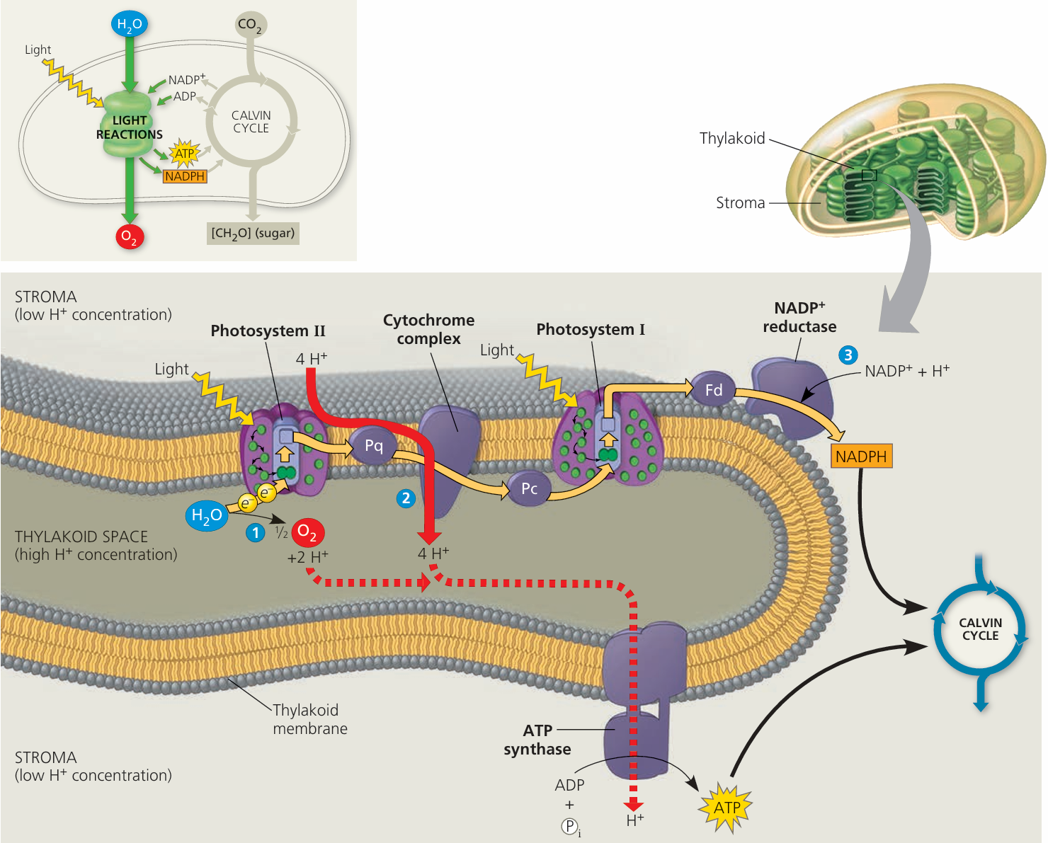 | ETC transfers electrons | Energy is used to pump H⁺ ions into the thylakoid lumen |