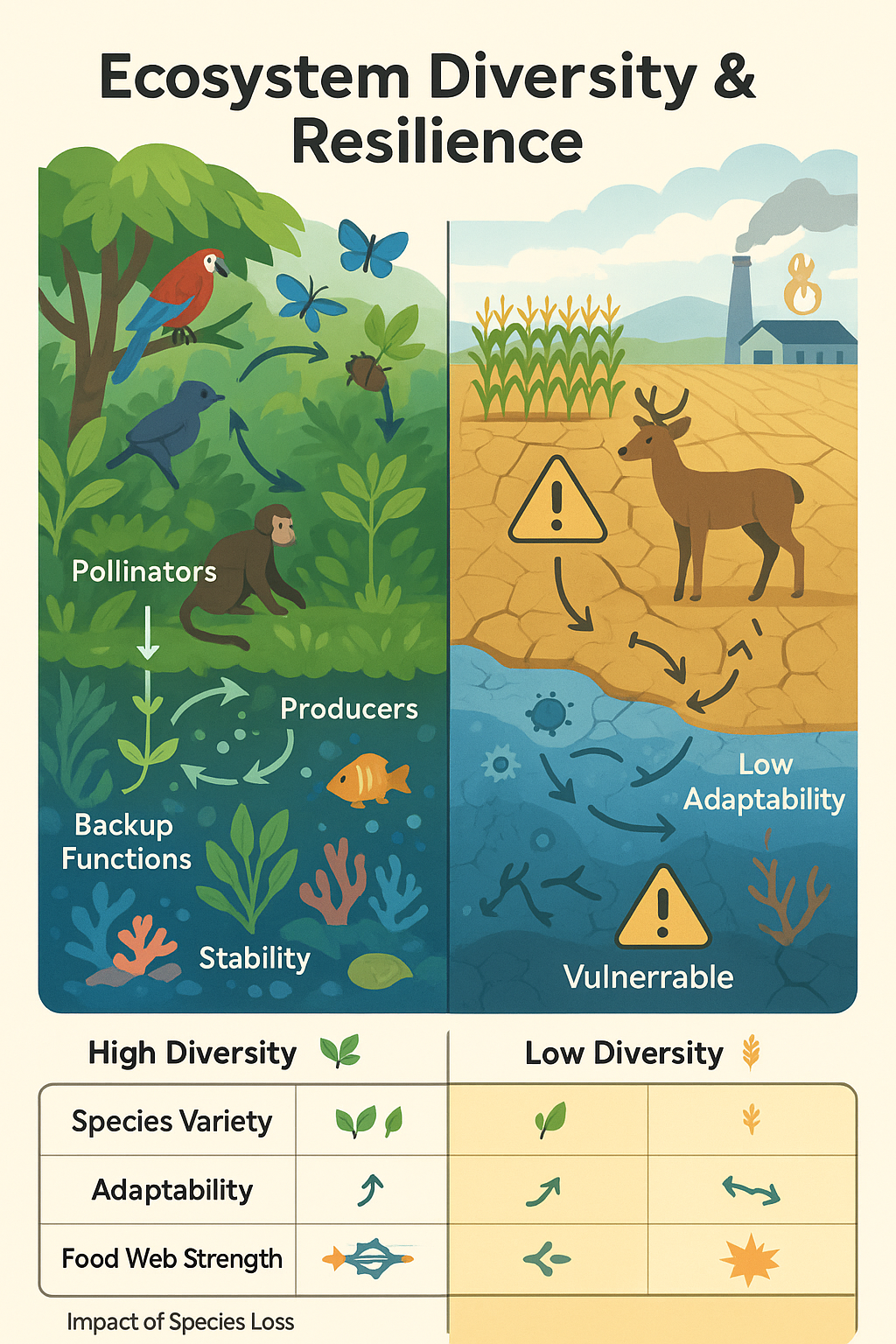 🌎 Ecosystems with greater biodiversity are stronger and more likely to bounce back from disturbances or adapt to new conditions.