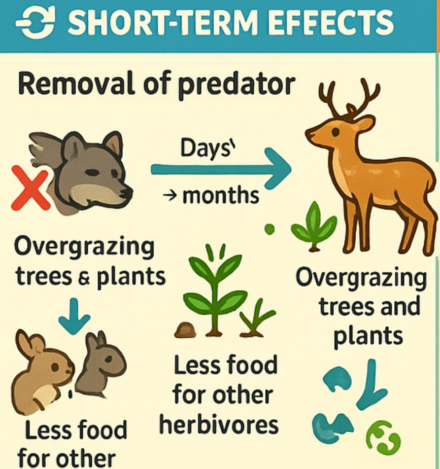| Wolf removal in Yellowstone | More elk, less vegetation | Riverbanks erode, biodiversity drops |