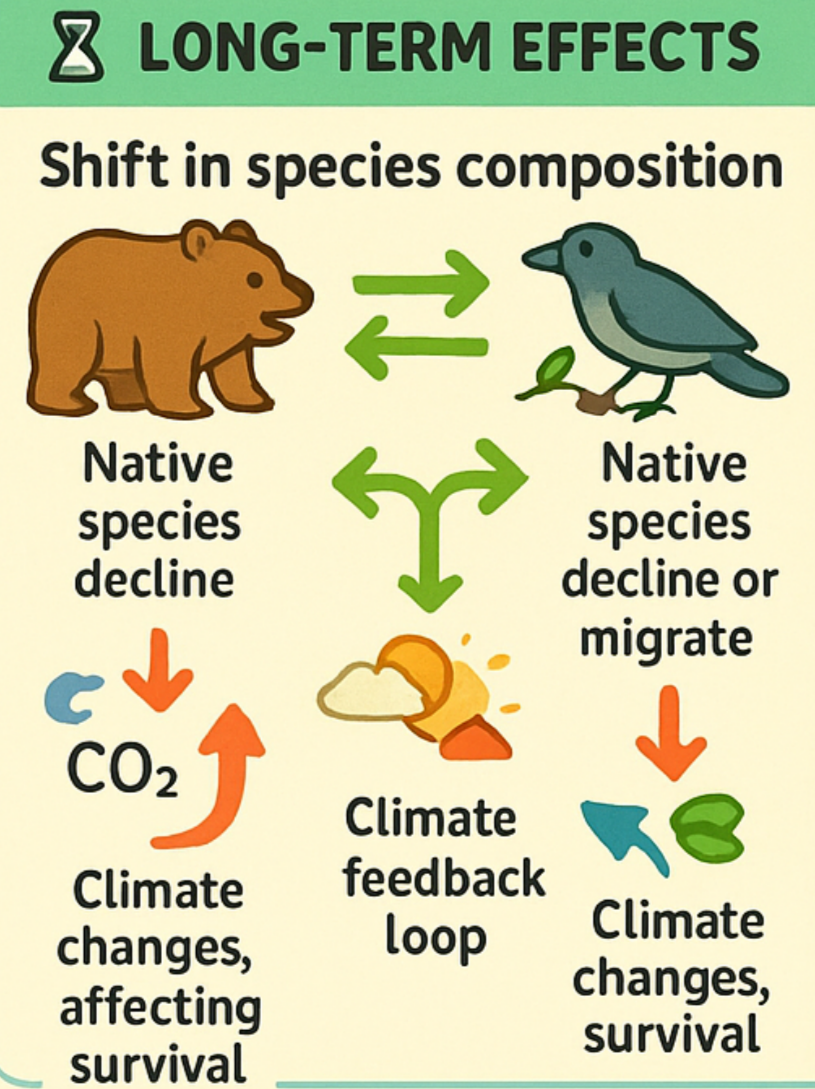 - If a new species dominates (invasive or adapted), native species may decline or migrate