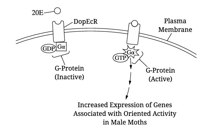 Increased DopEcR expression at sexual maturity allows more 20E binding and stronger signaling, leading to increased oriented activity toward pheromones, thereby improving mating success.