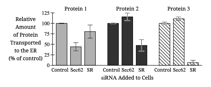 ✅ Answer: \( \boxed{\text{Protein 1 transport decreases with Sec62 siRNA, indicating Sec62 dependence and post-translational transport.}} \)