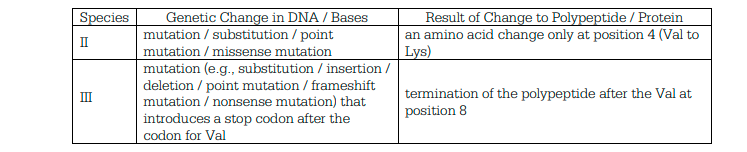 (a) Assuming that species I is the ancestral species of the group, explain the most likely genetic change that produced the polypeptide in species II and the most likely genetic change that produced the polypeptide in species III. (2 points maximum)
