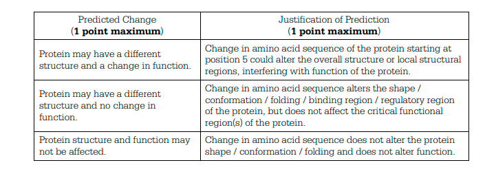 (b) The protein produced in species 4 will have a much different structure, and the function will be radically different. The frameshift mutation that resulted in the polypeptide completely altered the polypeptide chain, which in turn will change the intersections between amino acids, so the structure is changed. The altered amino acid segnence will cause the protein’s function to shift.