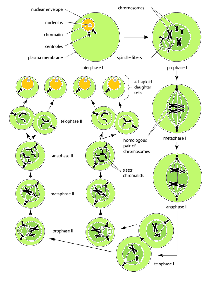 - Meiosis I: Homologous chromosomes separate
