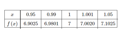 The graph of f shows that \(\lim_{x \to 1}f(x) =4\) and f(1)=7. This table is consistent with that information.