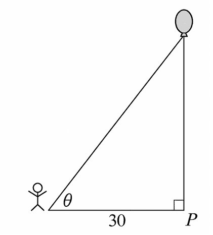 A person stands 30 feet from point \(P\) and watches a balloon rise vertically from the point, as shown in the figure above. The balloon is rising at a constant rate of 2 feet per second. What is the rate of change, in radians per second, of angle \(\theta\) at the instant when the balloon is 40 feet above point \(P\) ?