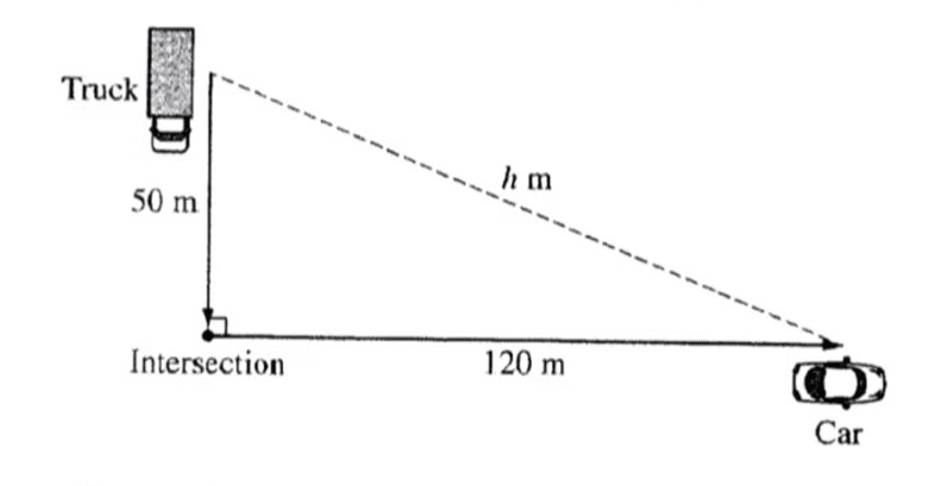 With \(x=120\) (car), \(y=50\) (truck), \(h^{2}=x^{2}+y^{2}\).