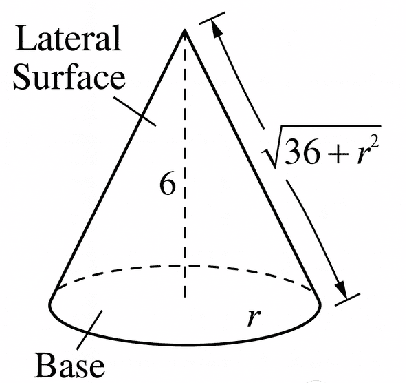 The right circular cone shown has a radius of \(r\) meters and a constant height of \(6\) meters. The lateral surface area of the cone, in square meters, is \(S(r)=\pi\sqrt{36r^{2}+r^{4}}\). At the instant when \(r=0.75\) meter, the radius is increasing at \(dr/dt=1.15\) meters per minute. At what rate is the lateral surface area changing, in square meters per minute, at that instant?