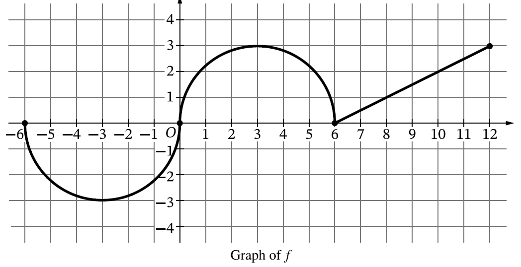 The continuous function \(f\) is defined on the closed interval \(-6\le x\le 12\). The graph of \(f\), consisting of two semicircles and one line segment, is shown in the figure (semicircle below the \(x\)-axis on \([-6,0]\), semicircle above the \(x\)-axis on \([0,6]\), and a line from \((6,0)\) to \((12,3)\)).