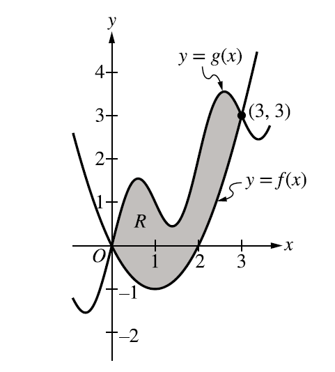 \(\displaystyle \text{Area}=\int_{0}^{3}\!\big(g(x)-f(x)\big)\,dx=\int_{0}^{3}\!\big(x+\sin(\pi x)-(x^{2}-2x)\big)\,dx\)
