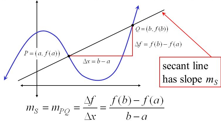 \( \text{Average rate of change} = \frac{f(b) – f(a)}{b – a} \)