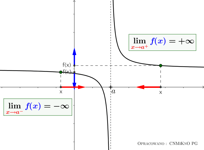 \( \lim_{x \to a^-} f(x) = \pm \infty \quad \text{or} \quad \lim_{x \to a^+} f(x) = \pm \infty. \)