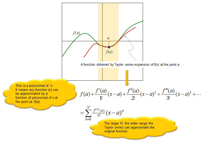 $ f(x) = \sum_{n=0}^{\infty} \dfrac{f^{(n)}(a)}{n!} (x-a)^n $