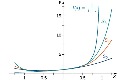 The graph shows a function and three approximations of it by partial sums of a power series.