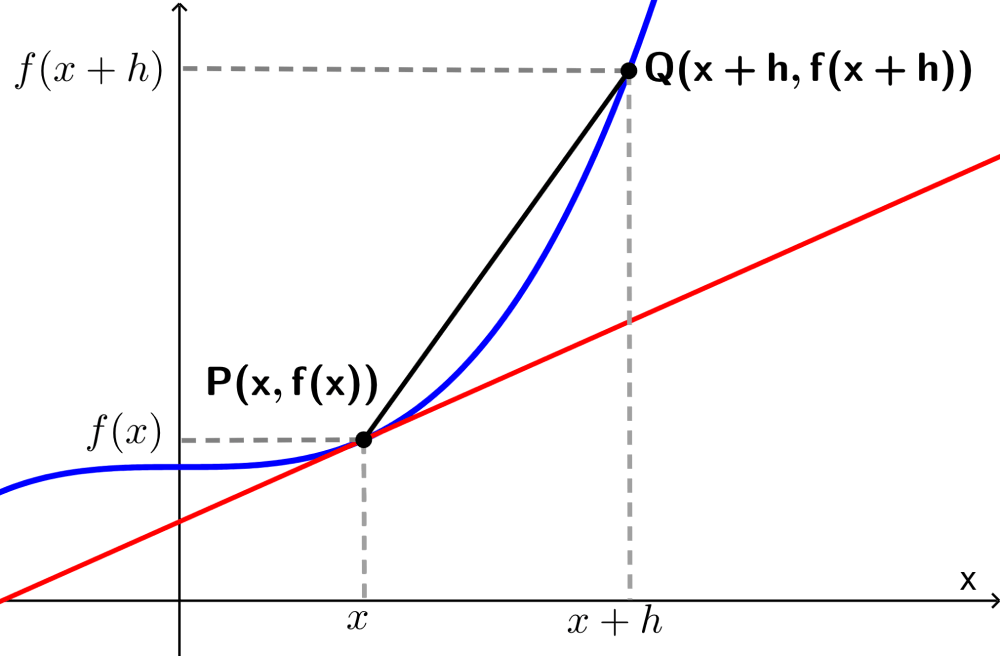 \( f'(x) = \lim_{h \to 0} \dfrac{f(x + h) – f(x)}{h} \)