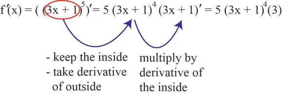 Key Idea: Differentiate the outer function, keep the inside unchanged, then multiply by the derivative of the inside function.