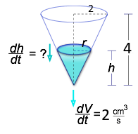 Differentiate: \( \frac{dV}{dt} = \frac{\pi}{12} \cdot 3h^2 \cdot \frac{dh}{dt} = \frac{\pi}{4} h^2 \cdot \frac{dh}{dt} \)