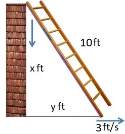 A 10-foot ladder is leaning against a vertical wall. The bottom of the ladder is sliding away from the wall at a rate of 3 ft/sec.