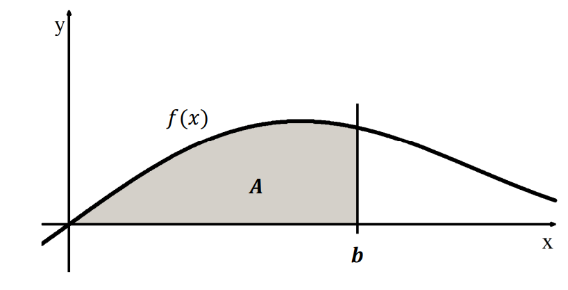 The figure shows the region \( A \), which is bounded by the \( x \)- and \( y \)-axes, the graph of the function \( f(x) = \dfrac{1 – \cos x}{x} \) for \( x > 0 \), and the vertical line \( x = b \).