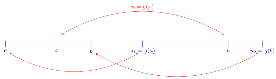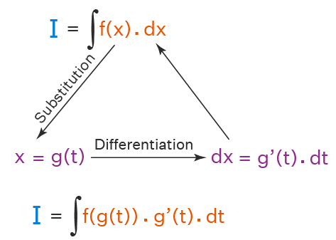 \(\displaystyle \int_a^b f(x)\,dx =\displaystyle \int_{u(a)}^{u(b)} f(g^{-1}(u)) \cdot \dfrac{dx}{du} \, du \)