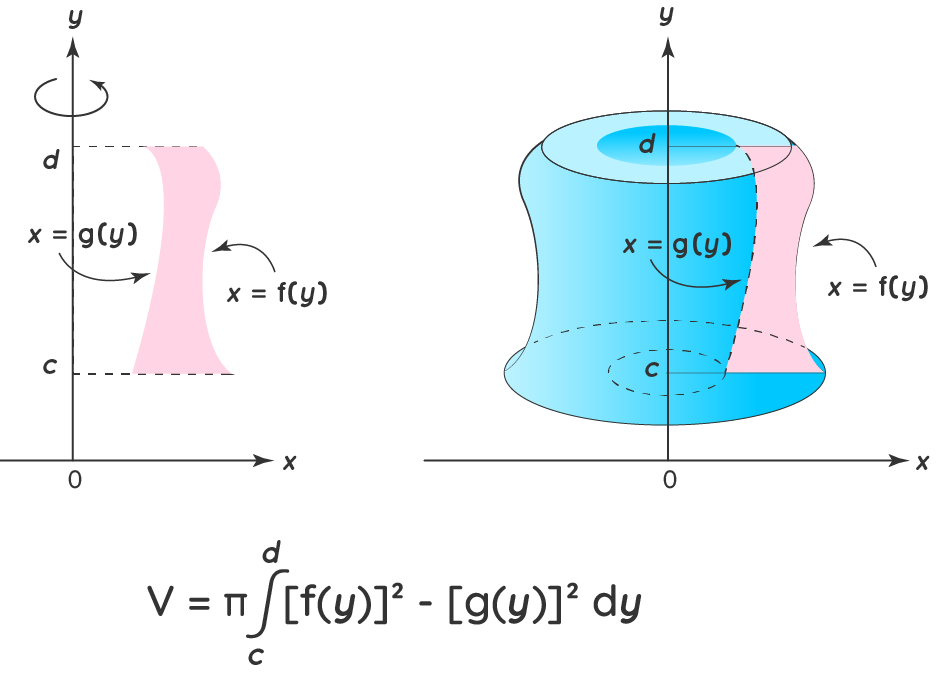 \( V = \pi \displaystyle \int_{c}^{d} \left[ R(y)^{2} – r(y)^{2} \right] \, dy \)